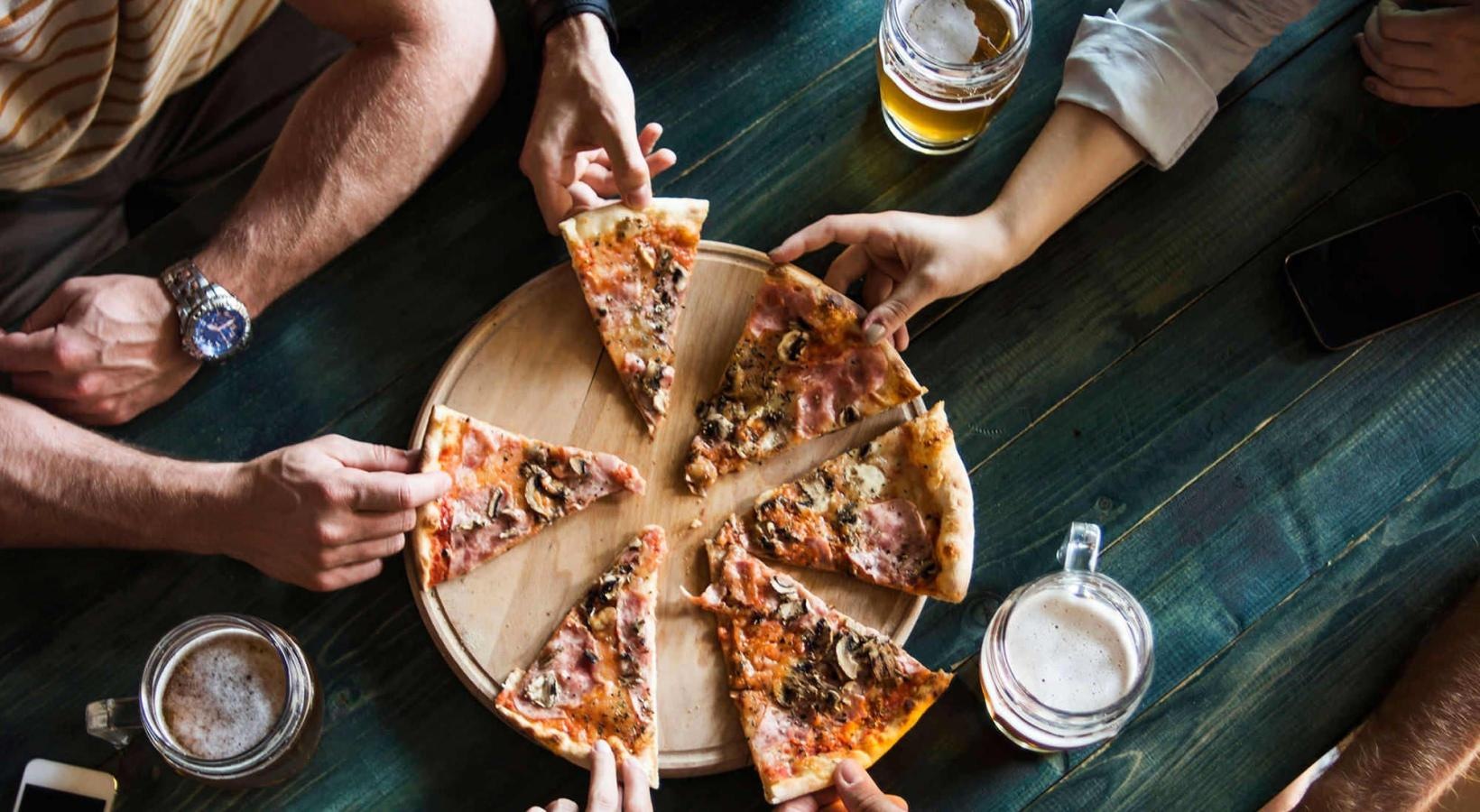 • a man and woman with take out, sit against a couch on their living room floor and watch at their cell phone